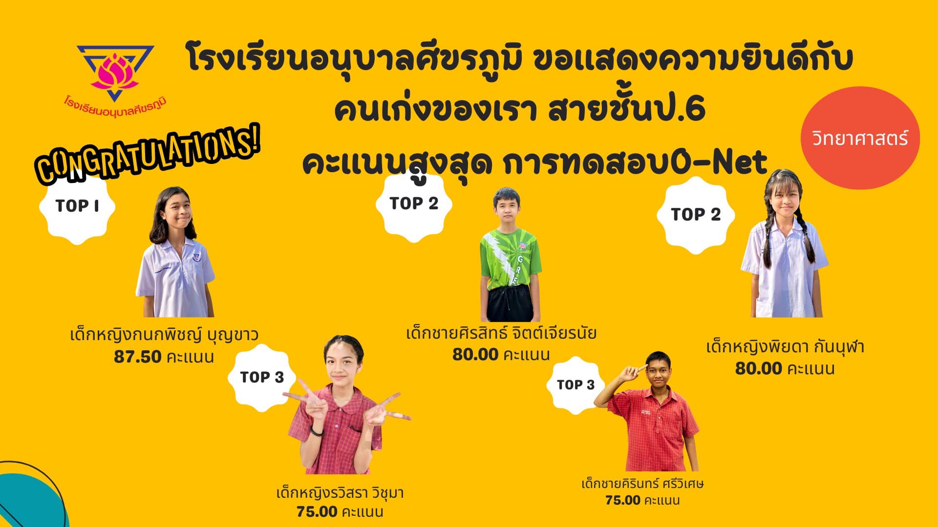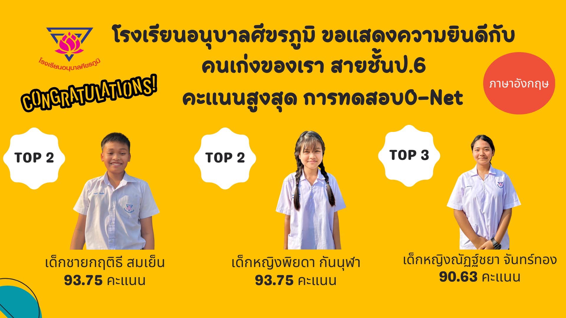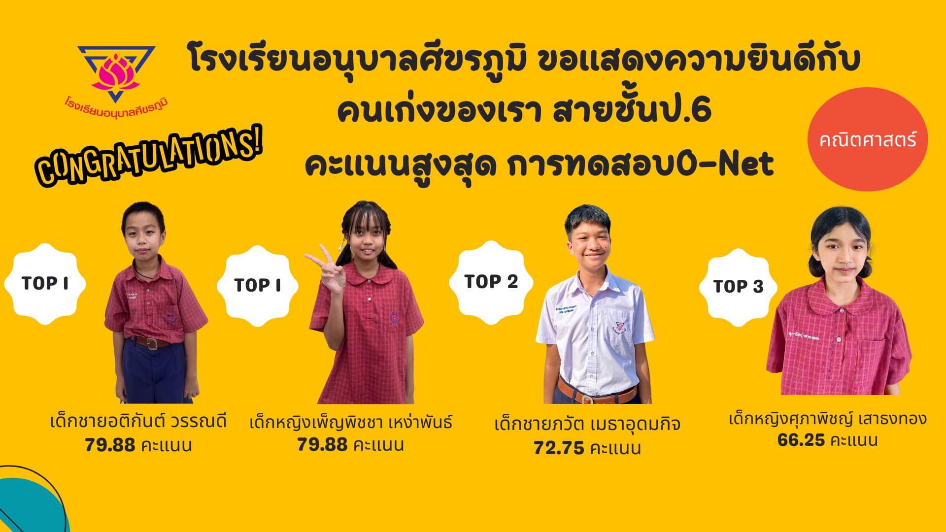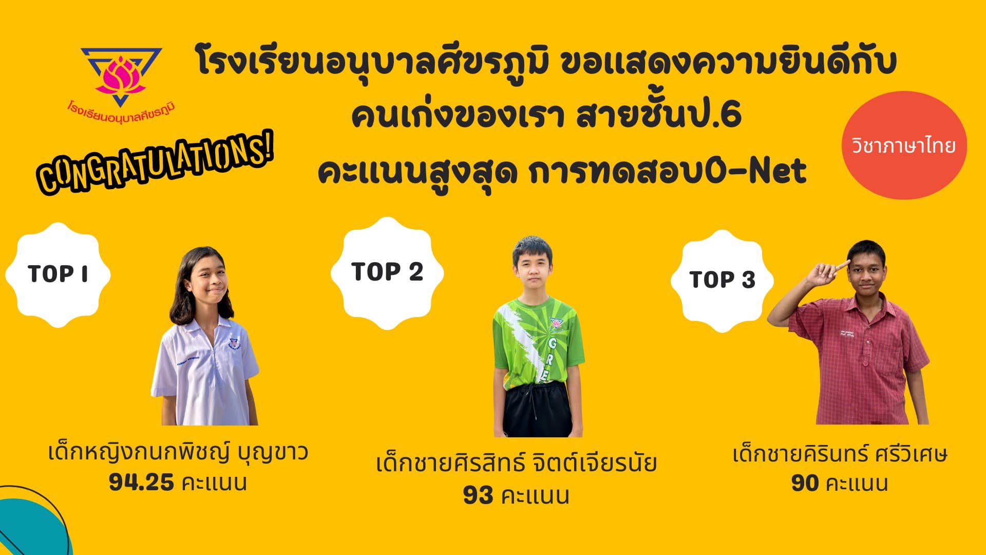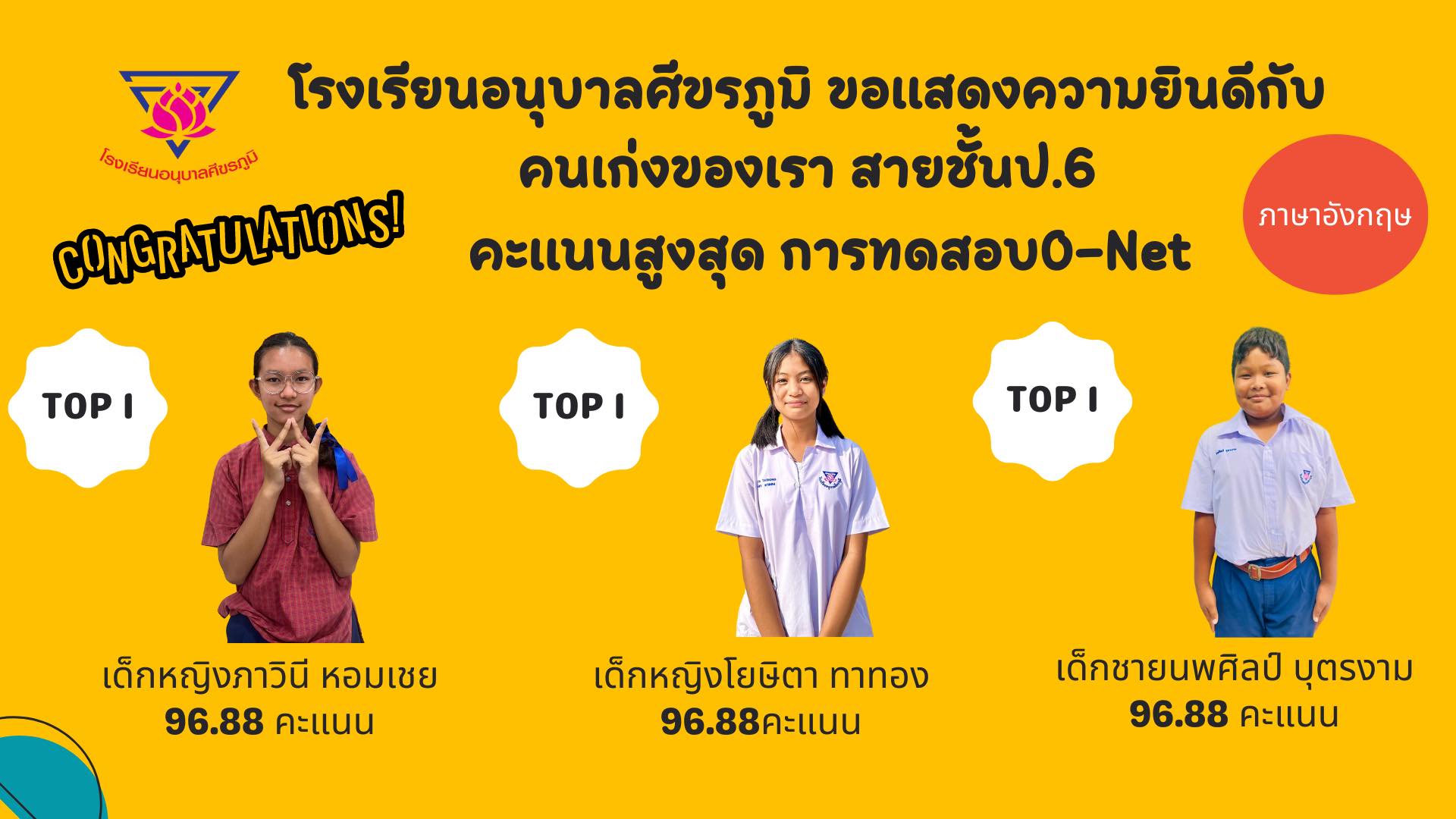 โรงเรียนอนุบาลศีขรภูมิ ขอแสดงความยินดีกับคนเก่งของเรา สายชั้นประถมศึกษาปีที่ 6 คะแนนสูงสุด การทดสอบ O-Net ในแต่ละวิชา **ค่าเฉลี่ยรวมสูงกว่าระดับชาติทุกวิชา