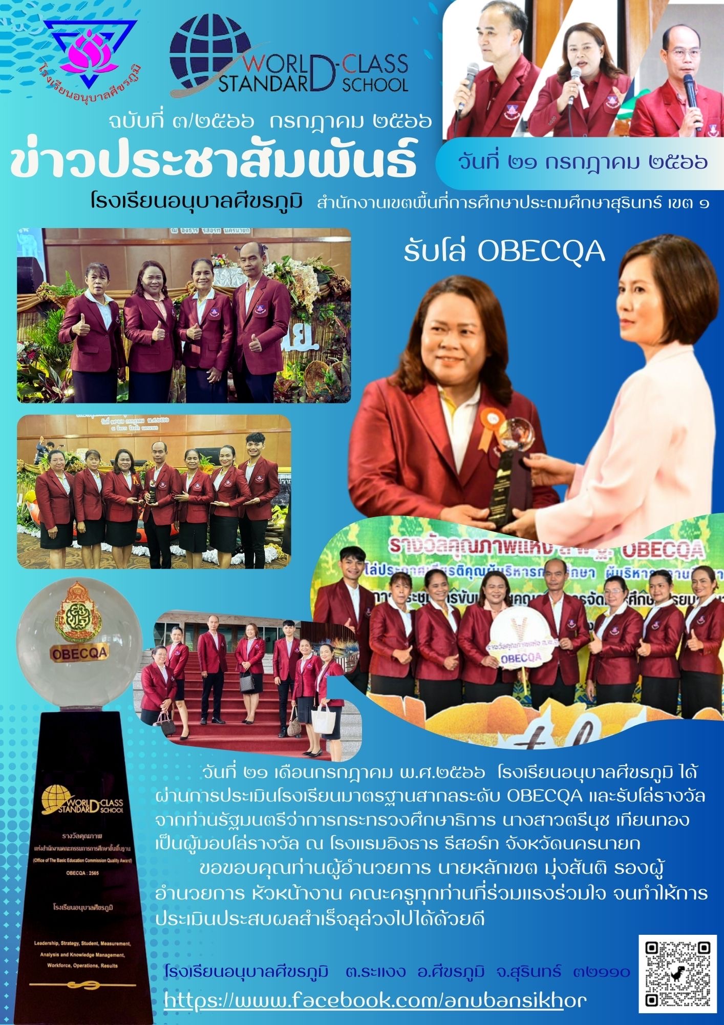 โรงเรียนอนุบาลศีขรภูมิ ได้ผ่านการประเมินโรงเรียนมาตรฐานสากลระดับ OBEC QA พร้อมรับโล่รางวัล มอบโดยนางสาวตรีนุช เทียนทอง รัฐมนตรีว่าการกระทรวงศึกษาธิการ