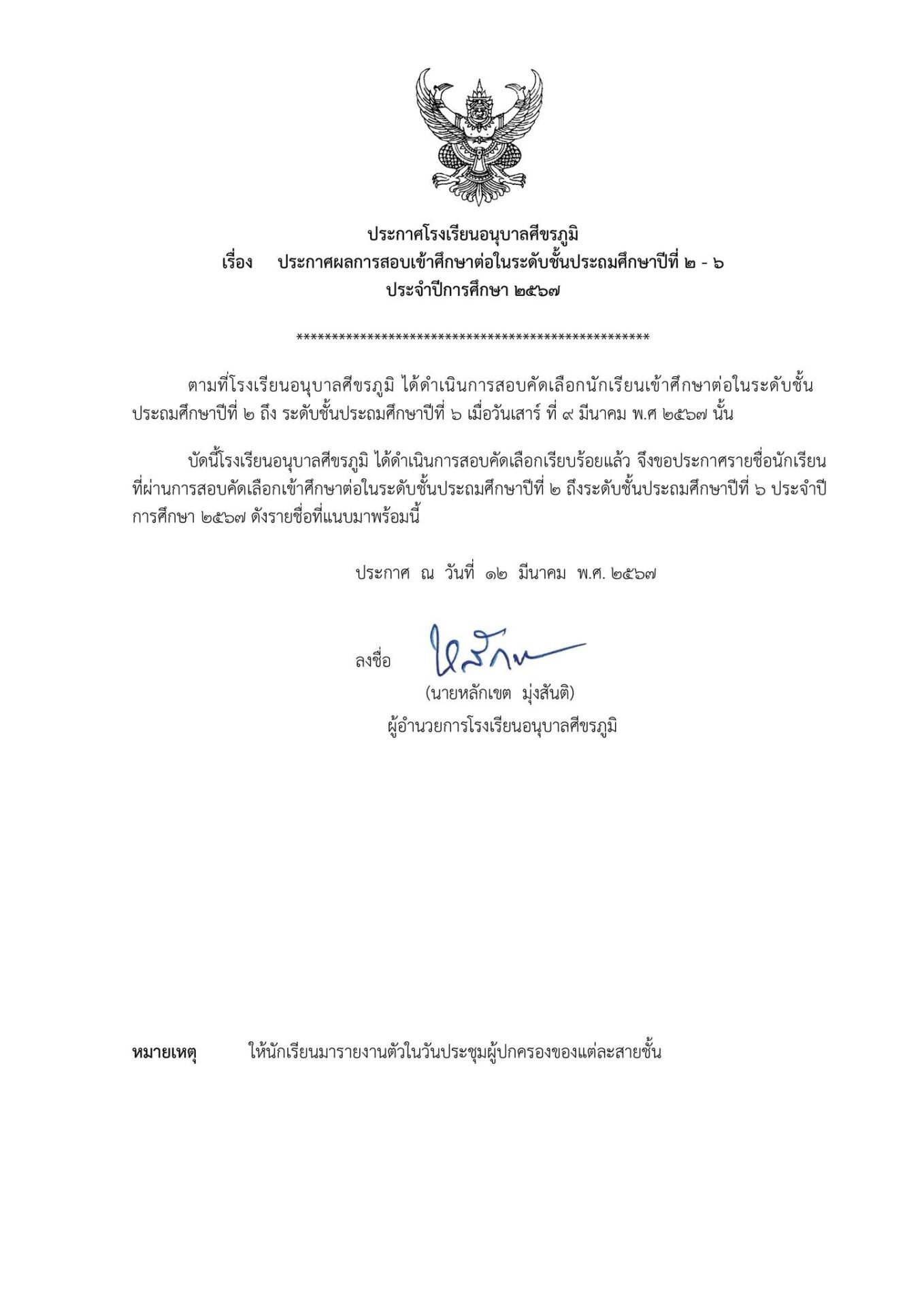 เรื่อง ประกาศผลการสอบเข้าศึกษาต่อในระดับชั้นประถมศึกษาปีที่ 2-6 ประจำปีการศึกษา 2567